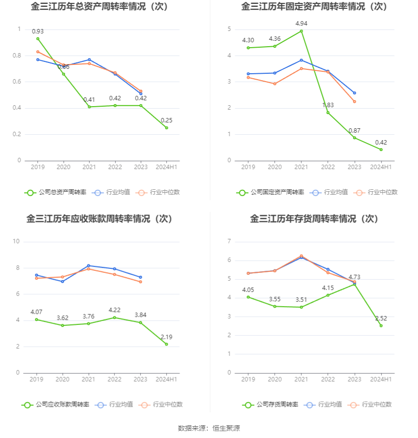 营运能力方面,2024年上半年,公司公司总资产周转率为0.25次,上年同期为0.19次(2023年上半年行业平均值为0.26次,公司位居同行业56/74);固定资产周转率为0.42次,上年同期为0.38次(2023年上半年行业平均值为1.34次,公司位居同行业70/74);公司应收账款周转率、存货周转率分别为2.19次、2.52次。