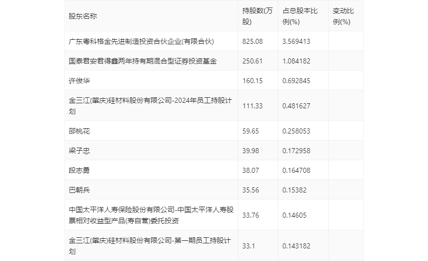 半年报显示,2024年上半年末的公司十大流通股东中,新进股东为2024年员工持股计划、段志勇、中国太平洋人寿保险股份有限公司-中国太平洋人寿股票相对收益型产品(寿自营)委托投资,取代了一季度末的金三江(肇庆)硅材料股份有限公司回购专用证券账户、华夏安泰对冲策略3个月定期开放灵活配置混合型发起式证券投资基金、曾勇。在具体持股比例上,许俊华持股有所上升,国泰君安君得鑫两年持有期混合型证券投资基金、梁子忠、巴朝兵持股有所下降。