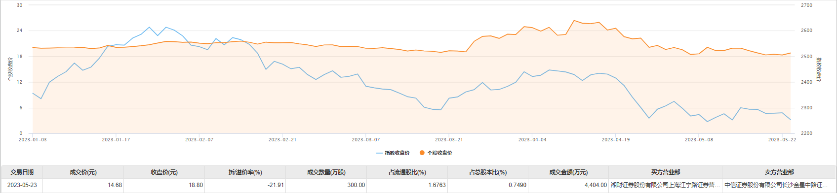 5月23日大宗交易成交300万股,成交额4404万元,占当日总成交额的18.78%,成交价14.68元,较市场收盘价18.8元折价21.91%。