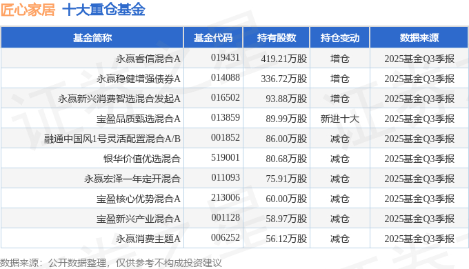 持有匠心家居最多的基金为永赢睿信混合A,目前规模为40.9亿元,最新净值2.1429(10月30日),较上一交易日下跌0.96%,近一年上涨85.08%。该基金现任基金经理为高楠。