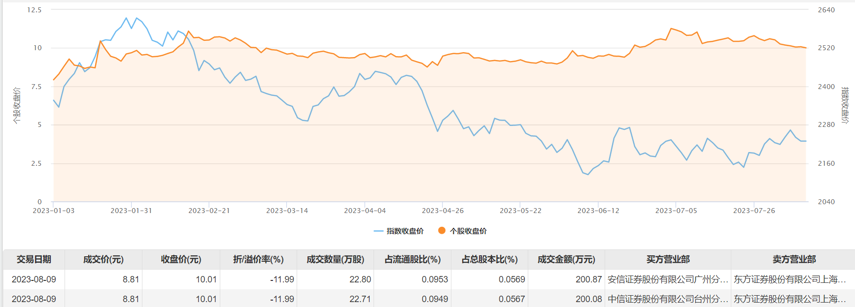 8月9日大宗交易成交45.51万股,成交额400.95万元,占当日总成交额的20.86%,成交价8.81元,较市场收盘价10.01元折价11.99%。