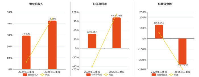 公司营业总收入为14.58亿元。归母净利润为4909.34万元,在已披露的同业公司中排名第59。经营活动现金净流入为-7302.46万元,在已披露的同业公司中排名第100,较去年同报告期经营活动现金净流入减少1.12亿元,同比较去年同期下降289.54%。