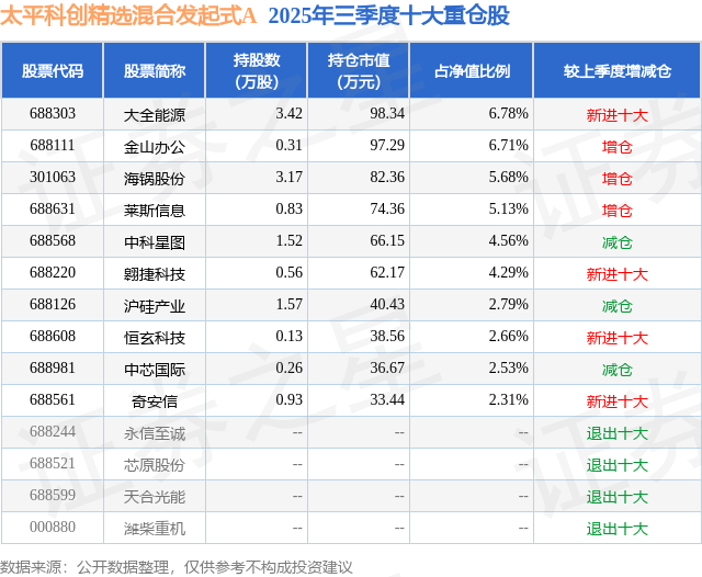 根据2025基金Q3季报公募基金重仓股数据,重仓该股的公募基金共1家,其中持有数量最多的公募基金为太平基金的太平科创精选混合发起式A。太平科创精选混合发起式A目前规模为0.14亿元,最新净值1.2811(11月12日),较上一交易日下跌1.03%,近一年上涨8.6%。该公募基金现任基金经理为杨行远。