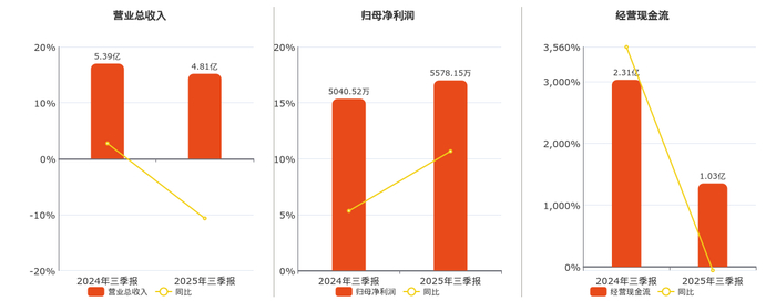 公司营业总收入为4.81亿元,较去年同报告期营业总收入减少5750.09万元,同比较去年同期下降10.67%。归母净利润为5578.15万元。经营活动现金净流入为1.03亿元,较去年同报告期经营活动现金净流入减少1.28亿元,同比较去年同期下降55.35%。