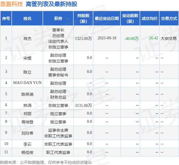 显盈科技近半年内的董监高及核心技术人员增减持详情如下: