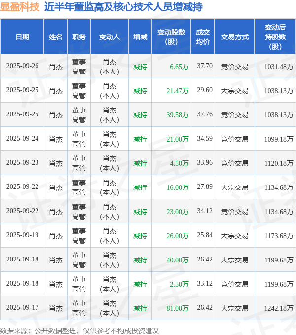 显盈科技:9月26日高管肖杰减持股份合计6.65万股