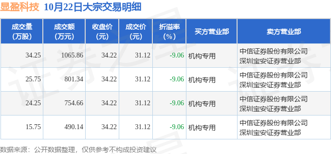 10月22日显盈科技现4笔大宗交易 机构净买入3112万元