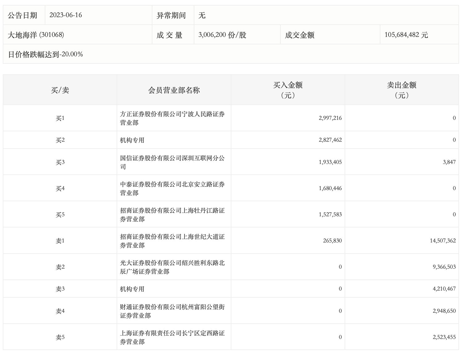 6月16日,大地海洋今日跌停,龙虎榜数据显示,上榜营业部席位全天成交4479.22万元,占当日总成交金额比例为42.38%。其中,买入金额为1123.19万元,卖出金额为3356.03万元,合计净卖出2232.83万元。