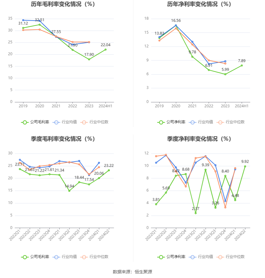 2024年上半年,公司毛利率为22.04%,同比上升4.26个百分点;净利率为7.89%,较上年同期上升1.62个百分点。从单季度指标来看,2024年第二季度公司毛利率为23.22%,同比上升8.28个百分点,环比上升3.16个百分点;净利率为9.92%,较上年同期上升0.53个百分点,较上一季度上升5.44个百分点。