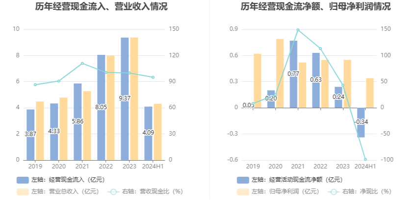 2024年上半年,公司营业收入现金比为94.99%,净现比为-98.77%。
