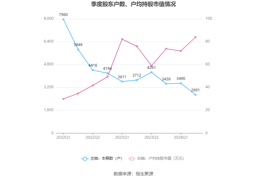 筹码集中度方面,截至2024年上半年末,公司股东总户数为2691户,较一季度末下降了799户,降幅22.89%;户均持股市值由一季度末的71.89万元上升至83.95万元,增幅为16.78%。