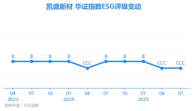日前,华证指数公布了新一期(2025年7月31日)的ESG评级结果,凯盛新材(301069.SZ)获得CCC评级(华证指数评级为C起至AAA九档,C为最低档,AAA为其最高一级评级/AA为其第二档),上一期(2025年4月30日)ESG评级为CCC。本期ESG评级在462家化学制品行业A股上市公司中排名第254(上一期排名第345)。