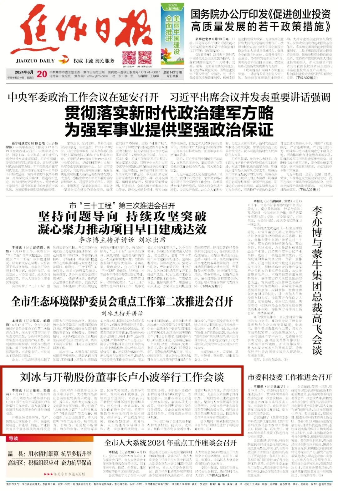 开勒股份是集研发、生产、销售及运营服务于一体,涵盖机械制造、新能源、储能、产业投资等多个业务板块的高科技企业,刘冰对卢小波董事长返乡洽谈项目合作,支持焦作经济社会高质量发展表示欢迎。他说,近年来,焦作大力实施文旅文创融合发展战略,着力打造了“太极功夫之都”“太行竹林水乡”“韩愈故里”等文化IP,精心组织了云台山旅游节、青天河红叶节等节会活动,城市吸引力、影响力、美誉度不断增强。如今的焦作,文旅资源丰富、区位优势突出、政策导向鲜明,发展机遇千载难逢,投资兴业恰逢其时。刘冰表示,开勒股份深耕环境科技领域多年,技术先进、成果丰硕,双方合作前景十分广阔。希望开勒股份充分发挥自身技术研发、市场平台、产业资源等优势,加强智慧文旅、政务服务、人工智能等领域项目合作,进一步强化科技赋能、丰富应用场景,不断提升文旅产业和政务服务领域数字化、智能化水平。焦作市将全力打造一流营商环境,落实各项支持政策,强化全周期要素供给和服务保障,为企业在焦发展创造良好条件,实现更高水平互利共赢。