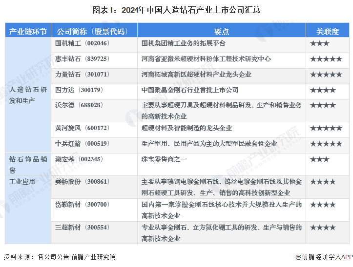 人造钻石行业产业链上下游的主要上市公司汇总如下: