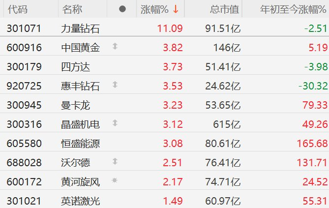 格隆汇10月9日|A股市场培育钻石股走强,其中,力量钻石涨11%,中国黄金、四方达、惠丰钻石、曼卡龙、晶盛机电、恒盛能源涨超3%,沃尔德、黄河旋风涨超2%。