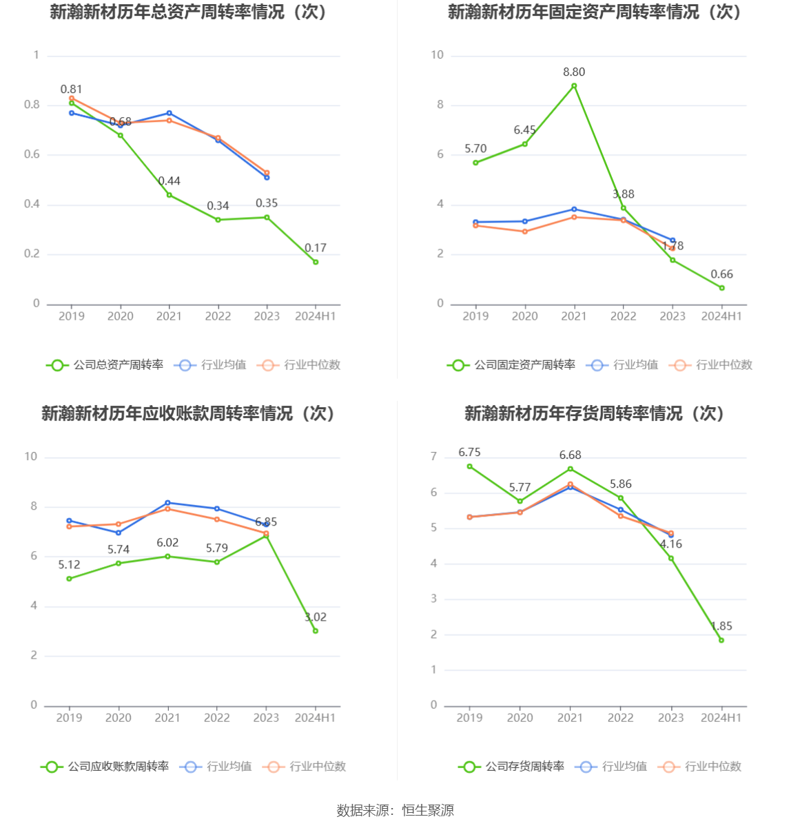 营运能力方面,2024年上半年,公司公司总资产周转率为0.17次,上年同期为0.19次(2023年上半年行业平均值为0.26次,公司位居同行业61/74);固定资产周转率为0.66次,上年同期为0.96次(2023年上半年行业平均值为1.34次,公司位居同行业42/74);公司应收账款周转率、存货周转率分别为3.02次、1.85次。