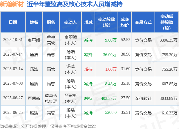 新瀚新材近半年内的董监高及核心技术人员增减持详情如下: