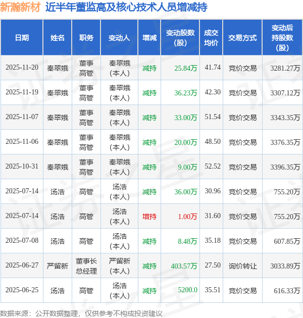新瀚新材近半年内的董监高及核心技术人员增减持详情如下: