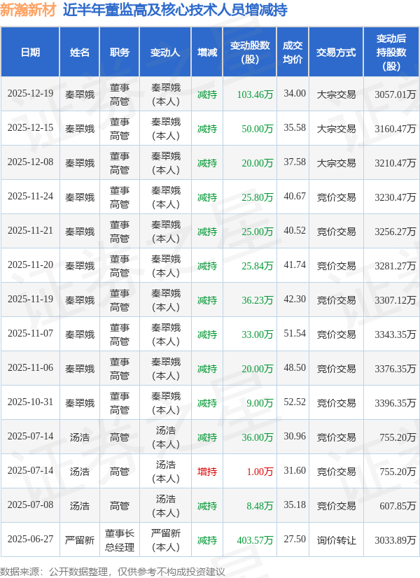 新瀚新材:12月19日高管秦翠娥减持股份合计103.46万股