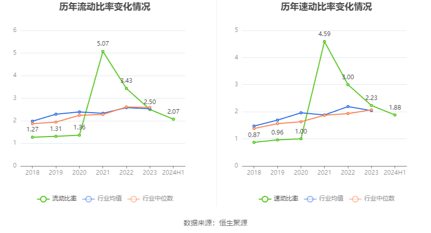 2024年上半年,公司流动比率为2.07,速动比率为1.88。