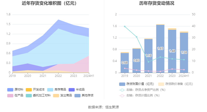 从存货变动来看,截至2024年上半年末,公司存货账面价值为1.38亿元,占净资产的11.25%,较上年末减少910.79万元。其中,存货跌价准备为375.12万元,计提比例为2.64%。