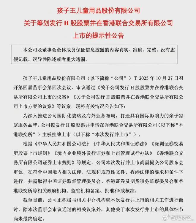 在母婴行业整体承压、出生率持续走低的背景下,孩子王这家A股上市的母婴零售龙头却逆势展开资本大动作。10月27日,孩子王正式发布公告宣布启动H股发行计划,拟登陆香港联合交易所主板。