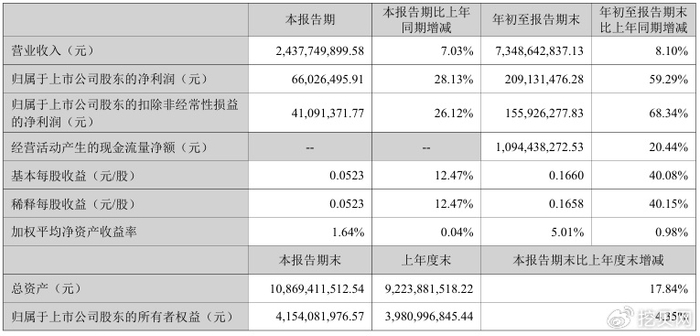 其中第三季度营收24.38亿元,同比增长7.03%;归母净利润6602.65万元,同比增长28.13%。