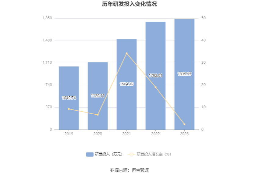 2023年全年,公司研发投入金额为1835.95万元,同比增长2.45%;研发投入占营业收入比例为6.66%,相比上年同期上升0.70个百分点。此外,公司全年研发投入资本化率为0。