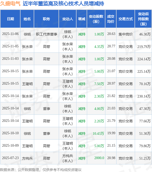 久盛电气近半年内的董监高及核心技术人员增减持详情如下: