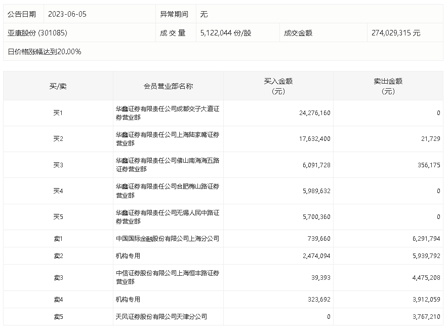 6月5日,亚康股份今日涨停,龙虎榜数据显示,上榜营业部席位全天成交8803.11万元,占当日总成交金额比例为32.12%。其中,买入金额为6326.71万元,卖出金额为2476.4万元,合计净买入3850.32万元。