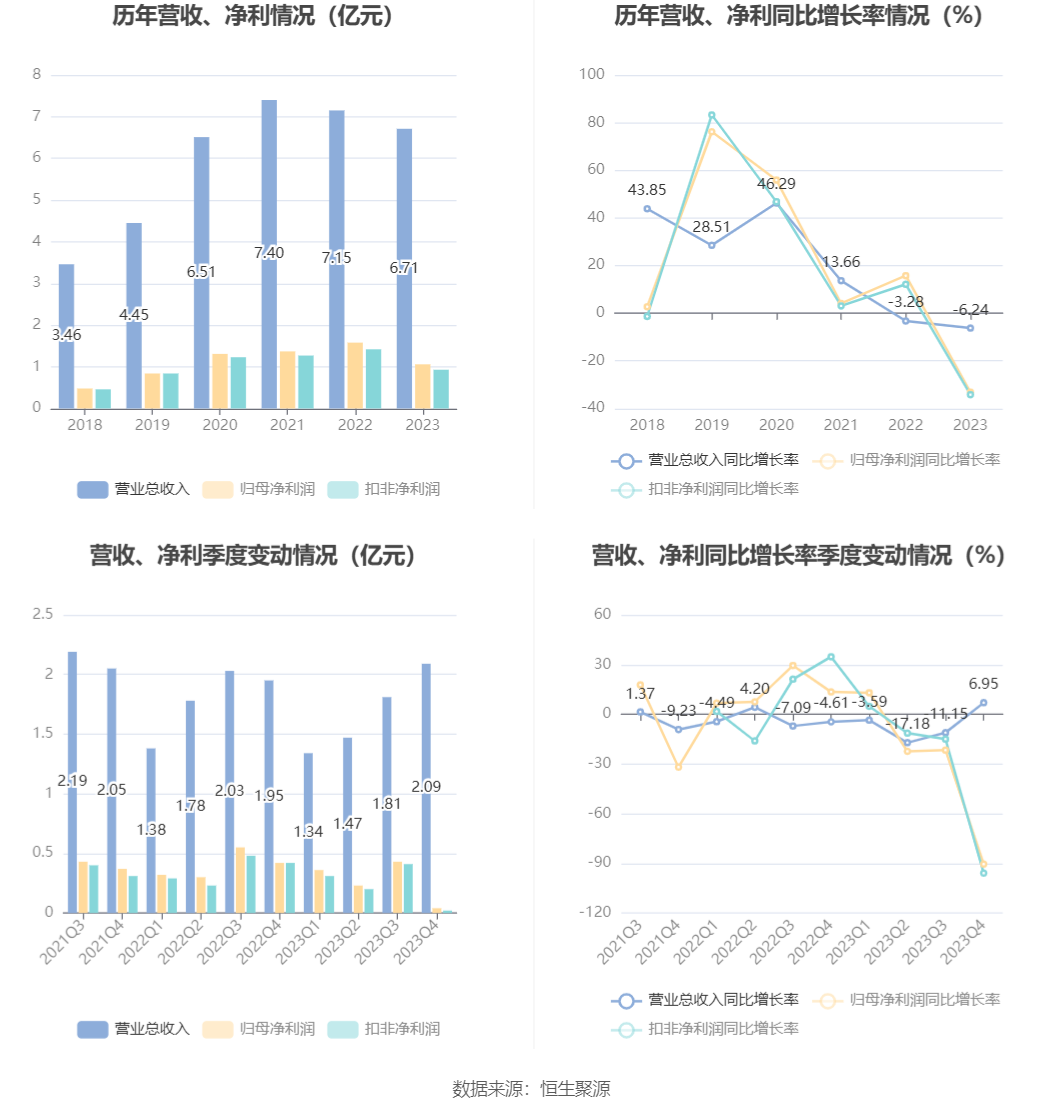 2023年,公司毛利率为38.53%,同比下降2.00个百分点;净利率为15.39%,较上年同期下降6.16个百分点。从单季度指标来看,2023年第四季度公司毛利率为31.54%,同比下降15.68个百分点,环比下降14.45个百分点;净利率为1.11%,较上年同期下降19.49个百分点,较上一季度下降22.76个百分点。