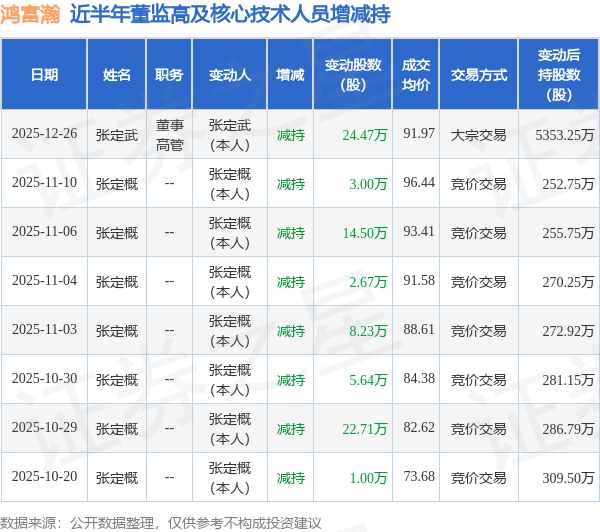 鸿富瀚:12月26日高管张定武减持股份合计24.47万股