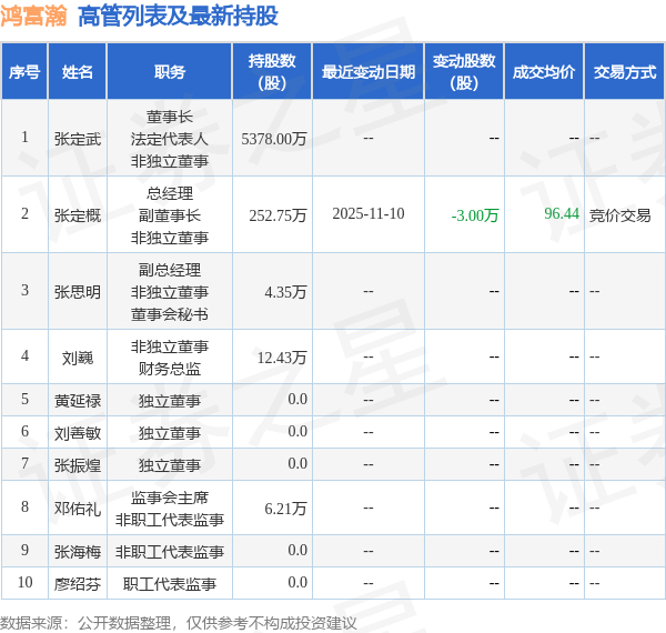 鸿富瀚的高管列表及最新持股情况如下: