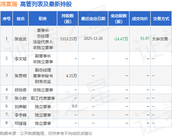 证券之星消息,根据1月5日市场公开信息、上市公司公告及交易所披露数据整理,鸿富瀚(301086)最新董监高及相关人员股份变动情况:2025年12月31日公司董事,高管张定武共减持公司股份6.67万股,占公司总股本为0.0741%。变动期间公司股价下跌1.31%,12月31日当日收盘报111.89元。