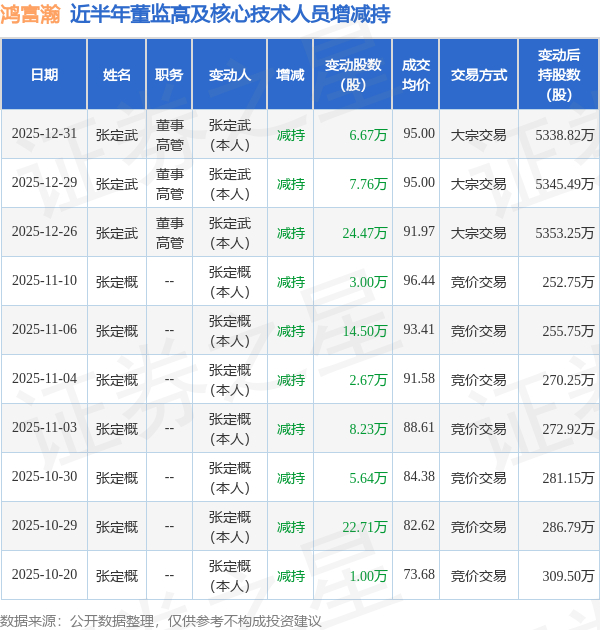 鸿富瀚:12月31日高管张定武减持股份合计6.67万股
