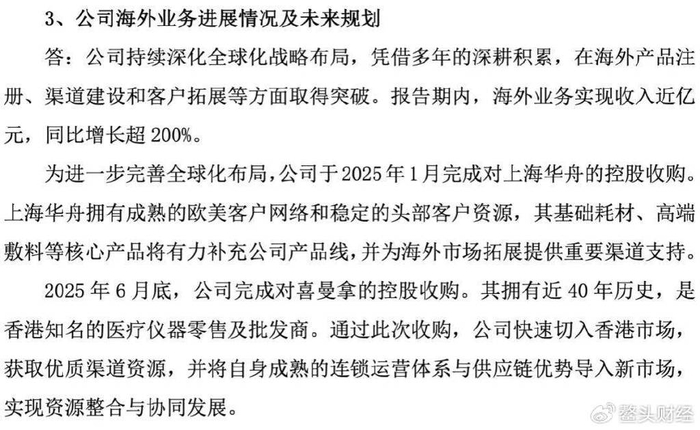 8月25日深交所互动易披露,可孚医疗在接受机构调研时明确提到:“公司持续深化全球化战略布局,凭借多年的深耕积累,在海外产品注册、渠道建设和客户拓展等方面取得突破。报告期内,海外业务实现收入近亿元,同比增长超 200%。”