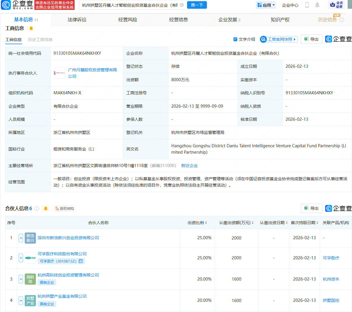 企查查APP显示,近日,杭州拱墅区丹麓人才智能创业投资基金合伙企业(有限合伙)成立,出资额8000万元,经营范围包含:创业投资(限投资未上市企业);以私募基金从事股权投资、投资管理、资产管理等活动等。企查查股权穿透显示,该合伙企业由深圳市新浩新兴创业投资有限公司、可孚医疗(301087.SZ)、杭州高科技创业投资管理有限公司等共同持股。