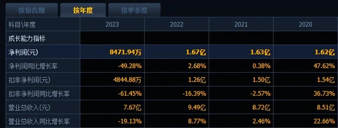 业绩是影响股票价格的重要因素。2021年和2022年,戎美股份增长失速,营收和净利润从2020年的双位数增长转为个位数增长。2023年,公司营收、归母净利润双双下滑,均创上市后新低,其中归母净利润下滑49%。