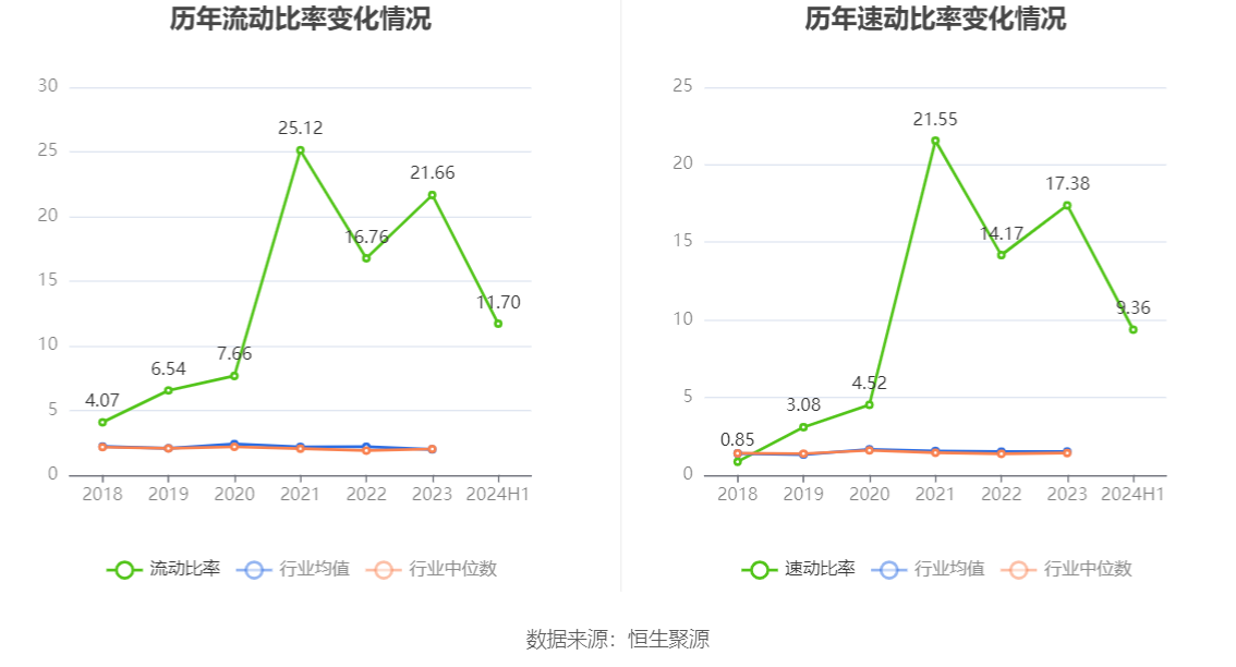 2024年上半年,公司流动比率为11.70,速动比率为9.36。
