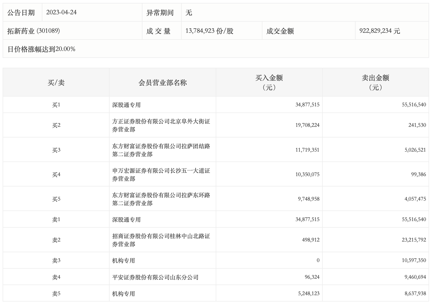 4月24日,拓新药业今日涨停,龙虎榜数据显示,上榜营业部席位全天成交2.09亿元,占当日总成交金额比例为22.66%。其中,买入金额为9224.75万元,卖出金额为1.17亿元,合计净卖出2460.57万元。