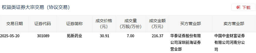 拓新药业今日大宗交易折价成交7万股,成交额216.37万元