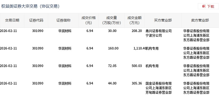 2月11日,华润材料大宗交易成交306.05万股,成交额2123.99万元,占当日总成交额的27.54%,成交价6.94元,较市场收盘价7.78元折价10.8%。