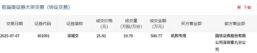 深城交今日大宗交易折价成交19.7万股,成交额500.77万元