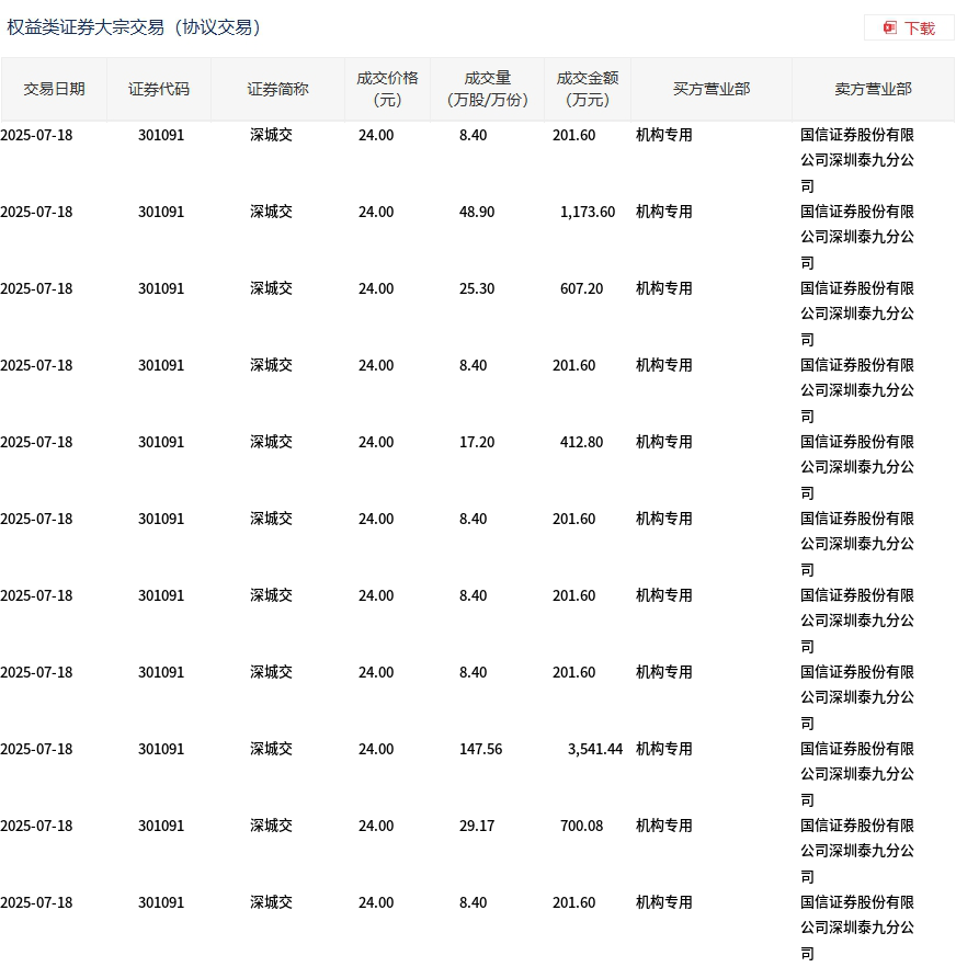 深城交今日大宗交易折价成交318.53万股,成交额7644.72万元