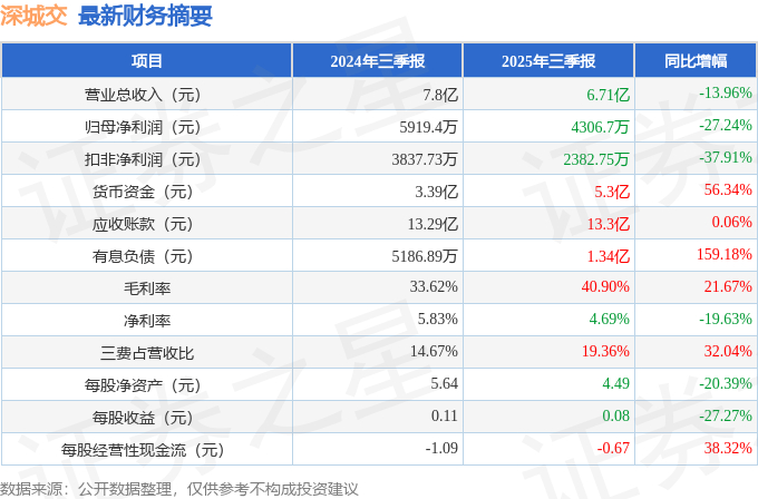 据证券之星公开数据整理,近期深城交(301091)发布2025年三季报。截至本报告期末,公司营业总收入6.71亿元,同比下降13.96%,归母净利润4306.7万元,同比下降27.24%。按单季度数据看,第三季度营业总收入2.56亿元,同比下降18.87%,第三季度归母净利润5246.63万元,同比下降23.79%。本报告期深城交三费占比上升明显,财务费用、销售费用和管理费用总和占总营收同比增幅达32.04%。