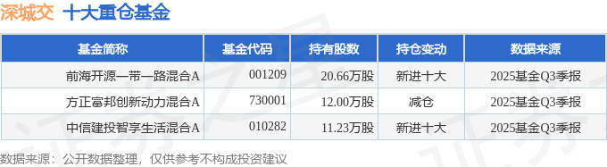 持有深城交最多的基金为前海开源一带一路混合A,目前规模为0.53亿元,最新净值0.631(10月29日),较上一交易日上涨0.48%,近一年下跌1.87%。该基金现任基金经理为吴国清。