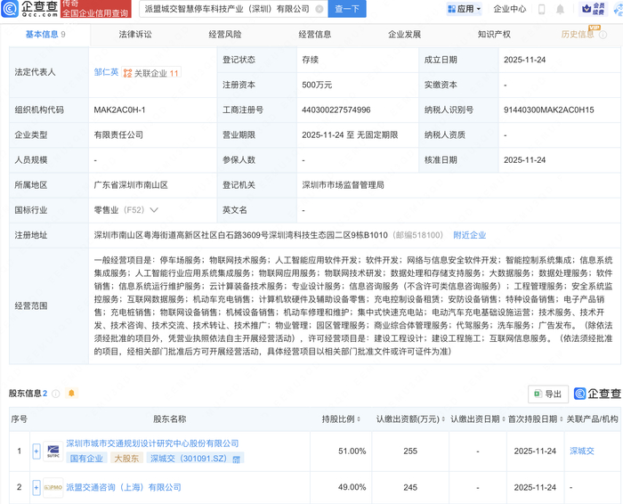 企查查APP显示,近日,派盟城交智慧停车科技产业(深圳)有限公司成立,经营范围包含:物联网技术服务;人工智能应用软件开发;人工智能行业应用系统集成服务;物联网应用服务等。企查查股权穿透显示,该公司由深城交(301091)等共同持股。