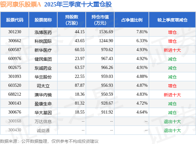 根据2025基金Q3季报公募基金重仓股数据,重仓该股的公募基金共1家,其中持有数量最多的公募基金为银河基金的银河康乐股票A。银河康乐股票A目前规模为1.56亿元,最新净值2.93(1月12日),较上一交易日上涨5.66%,近一年上涨47.53%。该公募基金现任基金经理为方伟。方伟在任的基金产品包括:银河医药混合A,管理时间为2022年3月22日至今,期间收益率为-9.0%。