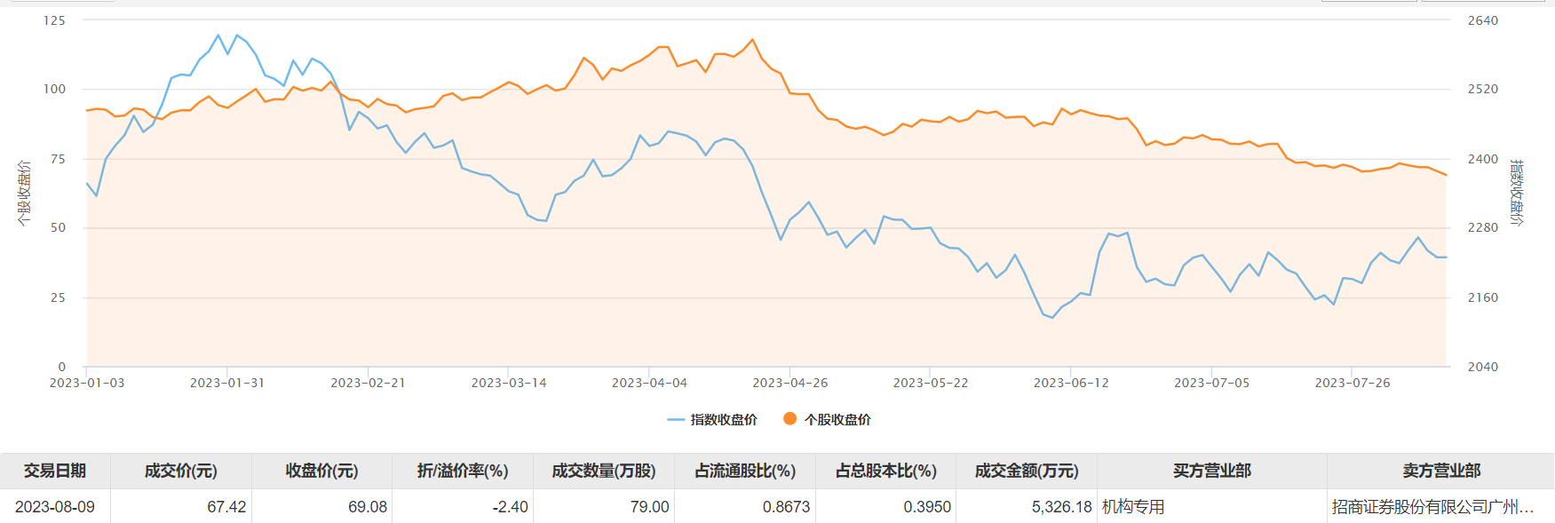 8月9日大宗交易成交79万股,成交额5326.18万元,占当日总成交额的28.03%,成交价67.42元,较市场收盘价69.08元折价2.4%。