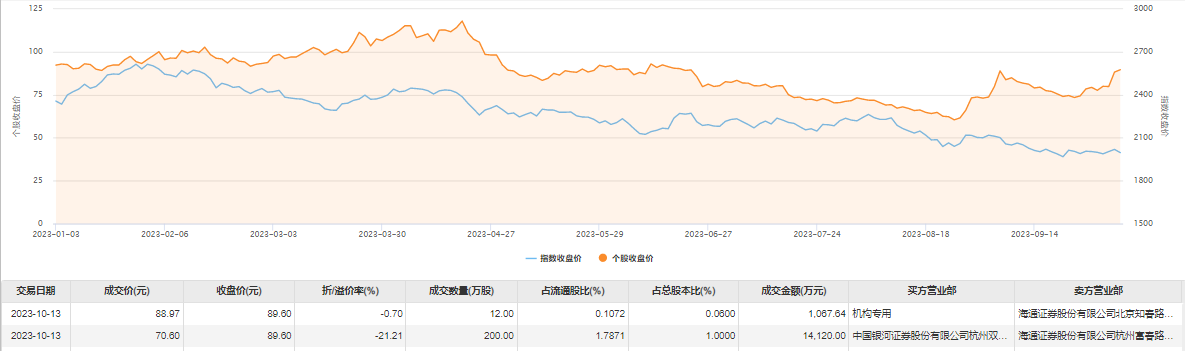 今日大宗交易成交212万股,成交额1.52亿元,占当日总成交额的24.64%,成交均价71.64元,较市场收盘价折价20.04%,其中最高成交价88.97元,最低成交价70.6元。